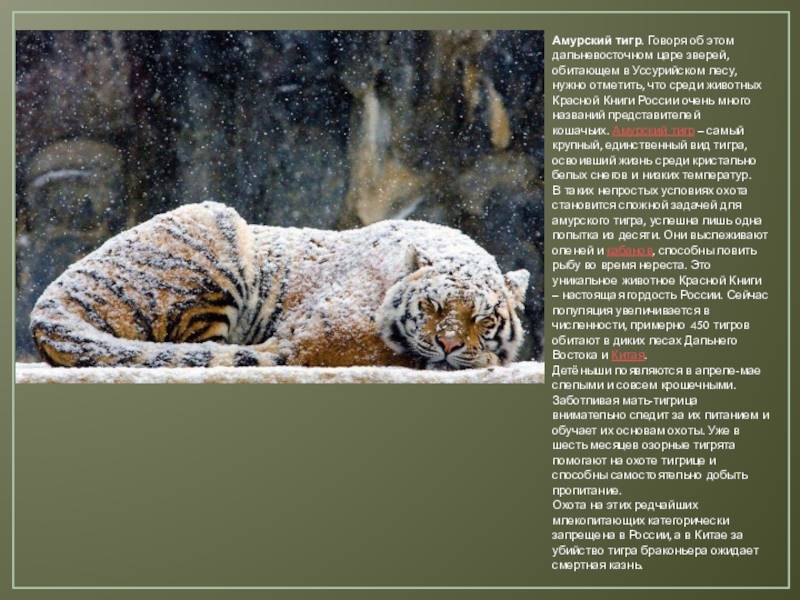 Слайд 13Амурский тигр. Говоря об этом дальневосточном царе зверей, обитающем в Уссурийском