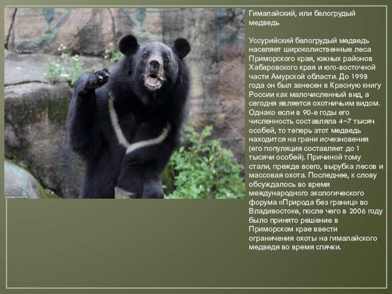 южных районов Хабаровского края и юго-восточной части Амурской области. До 1998 года он был занесен в Красную книгу России как малочисленный вид, а сегодня является охотничьим видом. Однако если в 90-е годы его численность составляла 4−7 тысяч особей, то теперь этот медведь находится на грани исчезновения (его популяция составляет до 1 тысячи особей). Причиной тому стали, прежде всего, вырубка лесов и массовая охота. Последнее, к слову обсуждалось во время международного экологического форума «Природа без границ» во Владивостоке, после чего в 2006 году было принято решение в Приморском крае ввести ограничения охоты на гималайского медведя во время спячки.