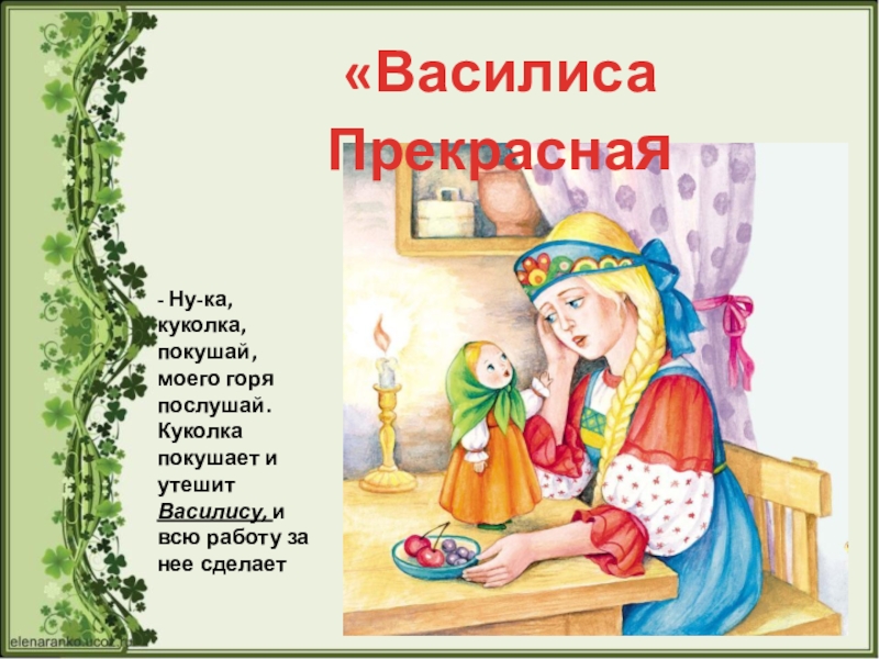 - Ну-ка, куколка, покушай, моего горя послушай. Куколка покушает и утешит Василису, и всю работу за нее сделает