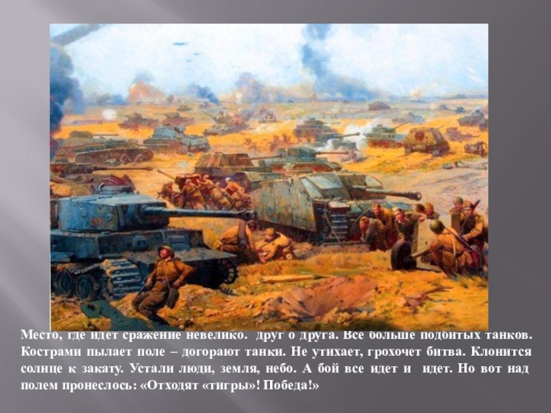 танков. Кострами пылает поле – догорают танки. Не утихает, грохочет битва. Клонится солнце к закату. Устали люди, земля, небо. А бой все идет и идет. Но вот над полем пронеслось: «Отходят «тигры»! Победа!»