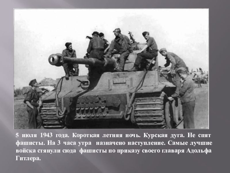5 июля 1943 года. Короткая летняя ночь. Курская дуга. Не спят фашисты. На 3 часа утра назначено наступление. Самые лучшие войска стянули сюда фашисты по приказу своего главаря Адольфа Гитлера.