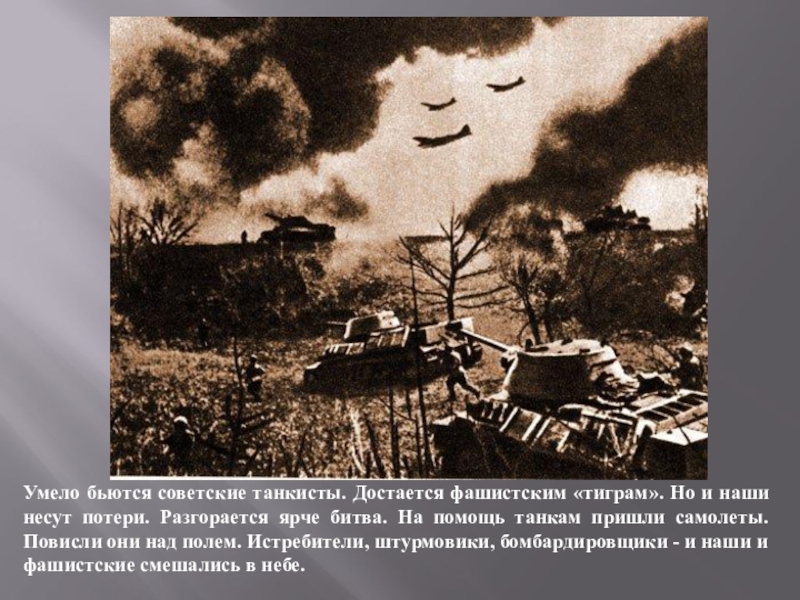 Слайд 9Умело бьются советские танкисты. Достается фашистским «тиграм». Но и наши несут