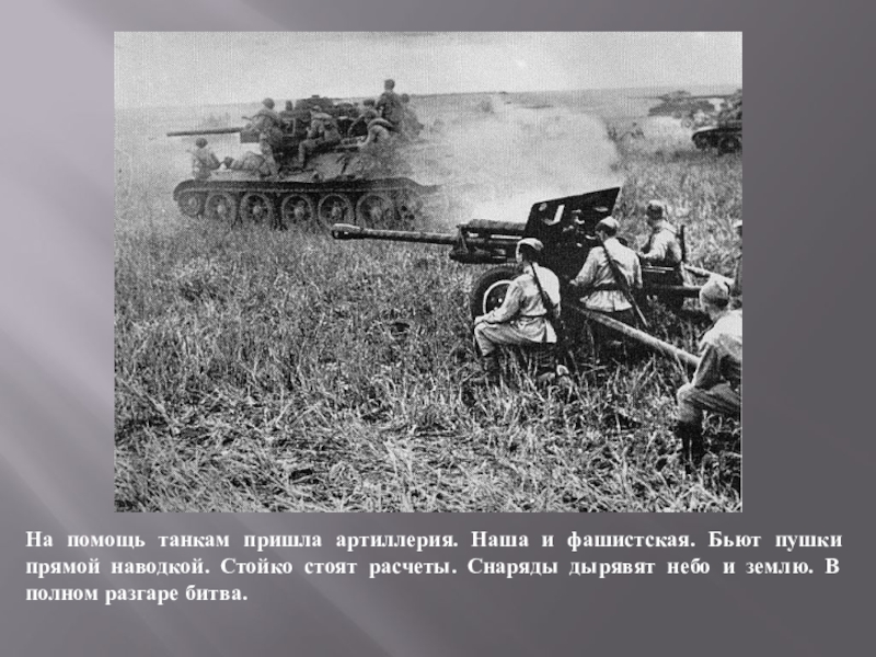 Слайд 10На помощь танкам пришла артиллерия. Наша и фашистская. Бьют пушки прямой
