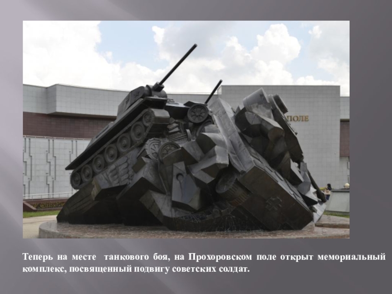 Слайд 13Теперь на месте танкового боя, на Прохоровском поле открыт мемориальный комплекс,