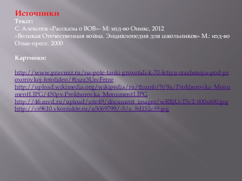 ИсточникиТекст:С. Алексеев «Рассказы о ВОВ»- М: изд-во Оникс, 2012«Великая Отечественная война. Энциклопедия для школьников» М.: изд-во Олма-пресс.