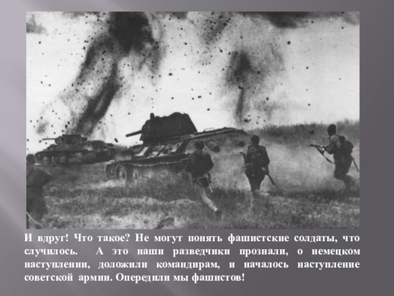 А это наши разведчики прознали, о немецком наступлении, доложили командирам, и началось наступление советской армии. Опередили мы фашистов!