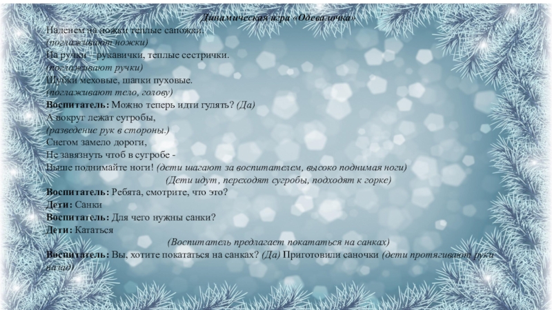 Оборудование: кукла в теплой одежде, санки, горка, подносы со снегом, картинки «Зимние забавы».