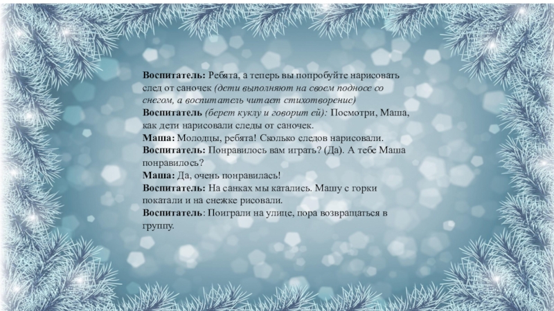 Воспитатель (берет куклу и говорит ей): Посмотри, Маша, как дети нарисовали следы от саночек.