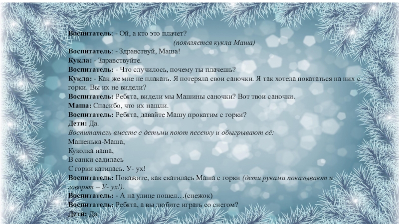 Воспитатель: Ребята, давайте Машу прокатим с горки?