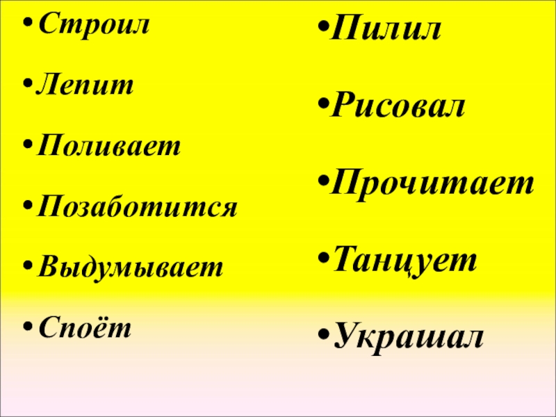 СтроилЛепитПоливаетПозаботитсяВыдумываетСпоётПилилРисовалПрочитаетТанцуетУкрашал