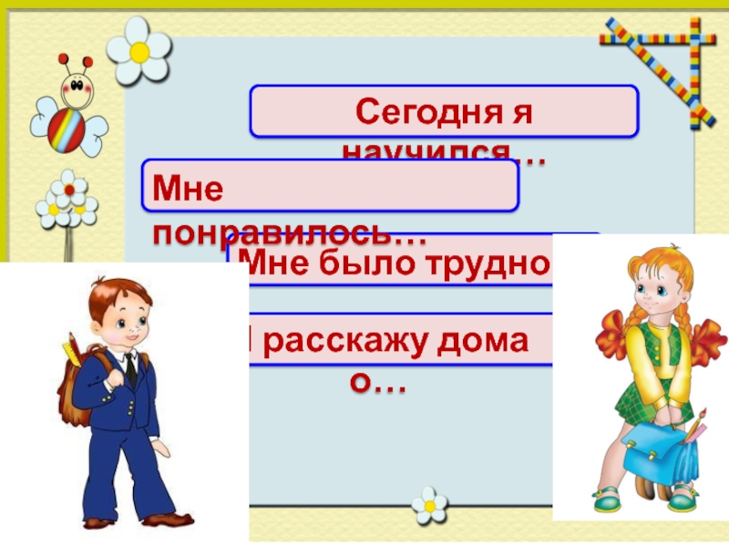 Сегодня я научился…Я расскажу дома о…Мне было трудно…Мне понравилось…