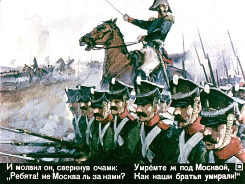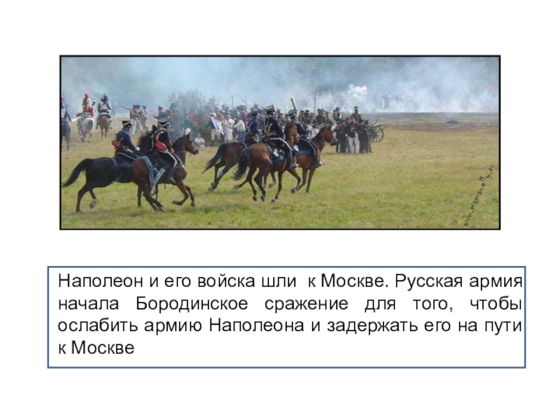 Наполеон и его войска шли к Москве. Русская армия начала Бородинское сражение для того, чтобы ослабить армию Наполеона и задержать его на пути к Москве