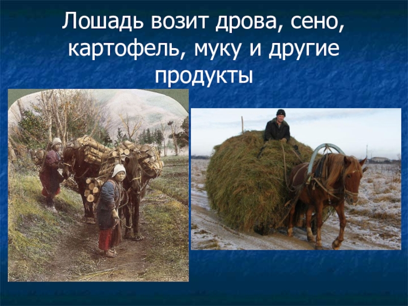 Слайд 9Лошадь возит дрова, сено, картофель, муку и другие продукты