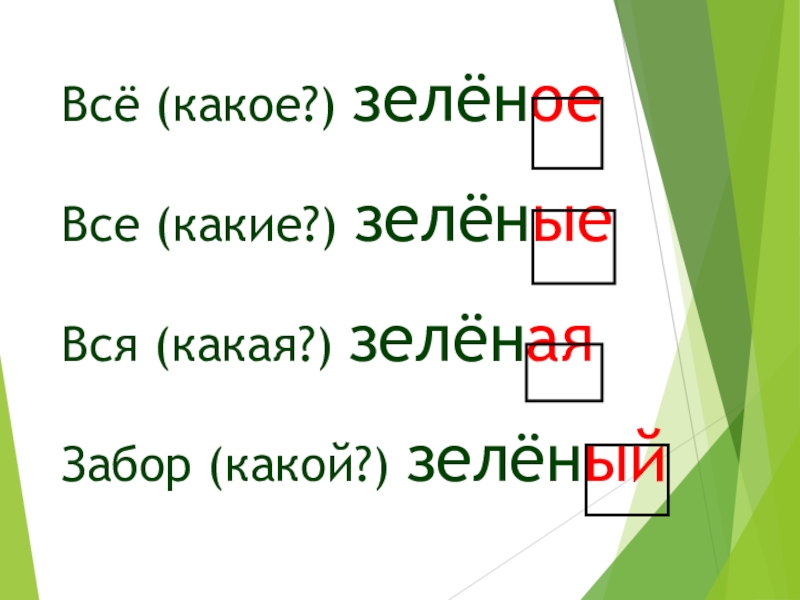 Всё (какое?) зелёное Все (какие?) зелёные Вся (какая?) зелёная Забор (какой?) зелёный