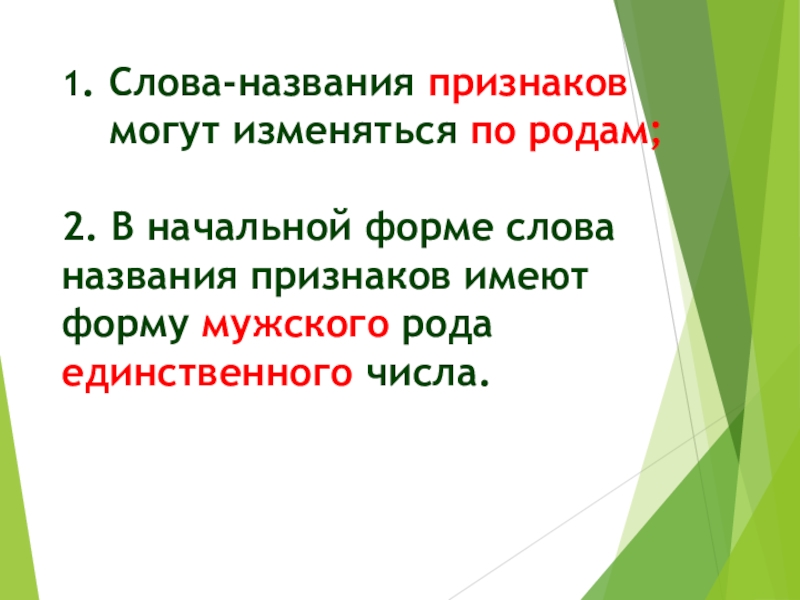 Слайд 141. Слова-названия признаков могут изменяться по родам; 2. В начальной