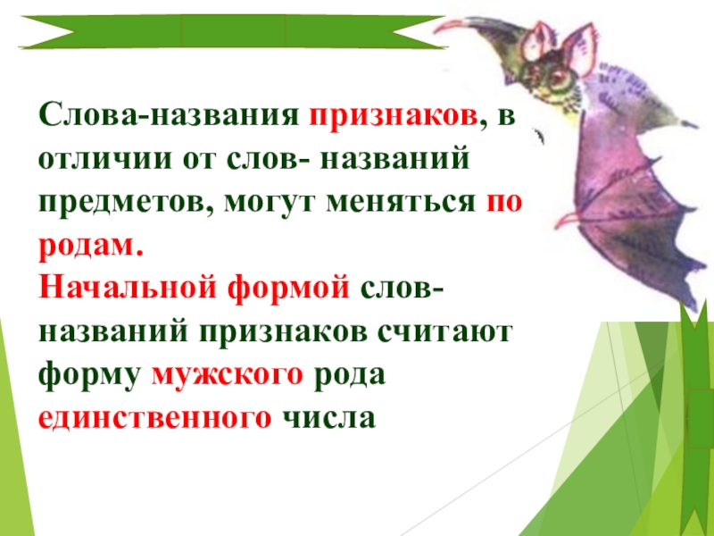 Слова-названия признаков, в отличии от слов- названий предметов, могут меняться по родам.Начальной формой слов-названий признаков считают форму