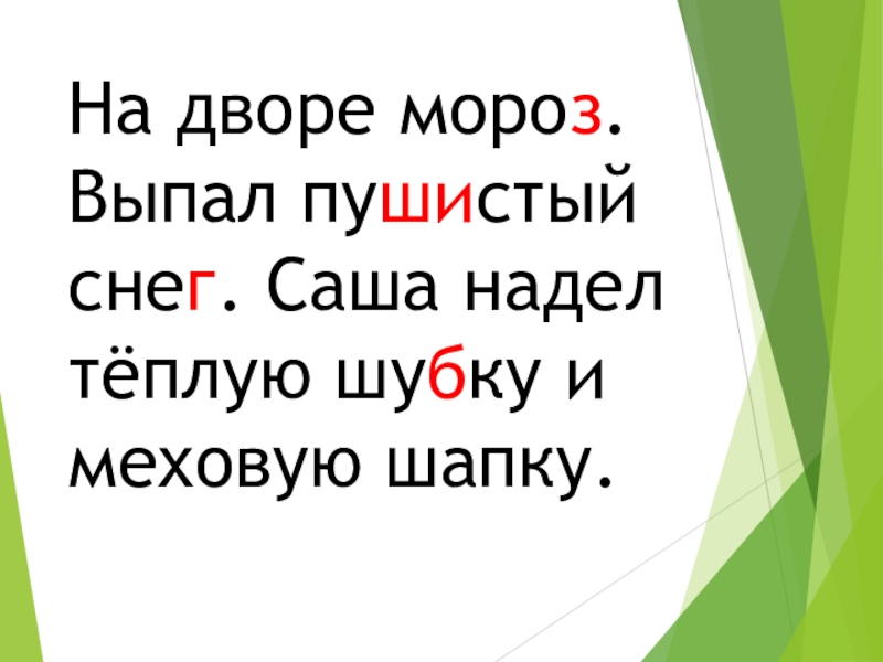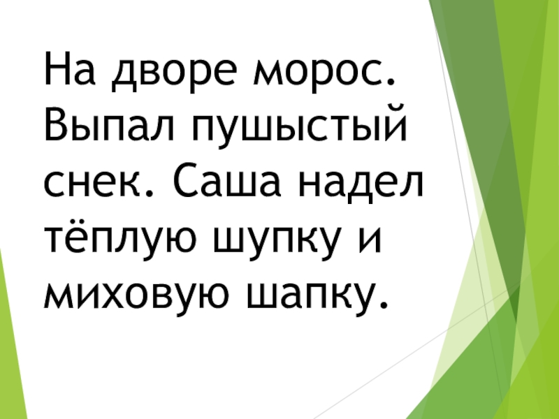 Слайд 3На дворе морос. Выпал пушыстый снек. Саша надел тёплую шупку и