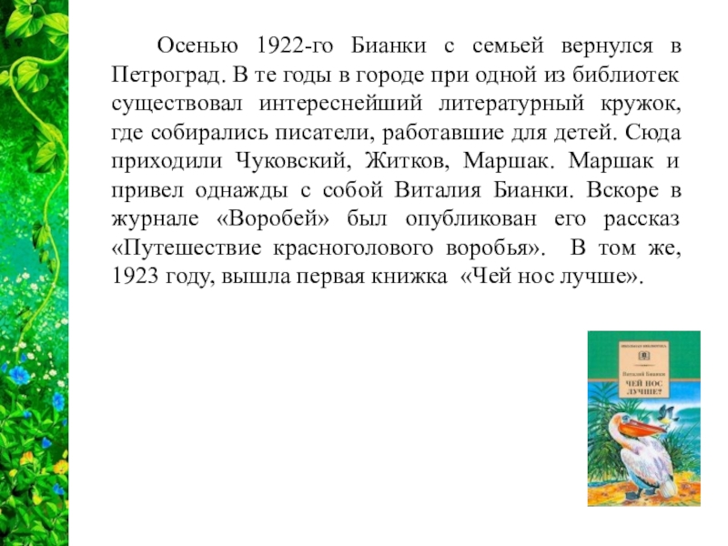 в городе при одной из библиотек существовал интереснейший литературный кружок, где собирались писатели, работавшие для детей. Сюда приходили Чуковский, Житков, Маршак. Маршак и привел однажды с собой Виталия Бианки. Вскоре в журнале «Воробей» был опубликован его рассказ «Путешествие красноголового воробья». В том же, 1923 году, вышла первая книжка «Чей нос лучше».