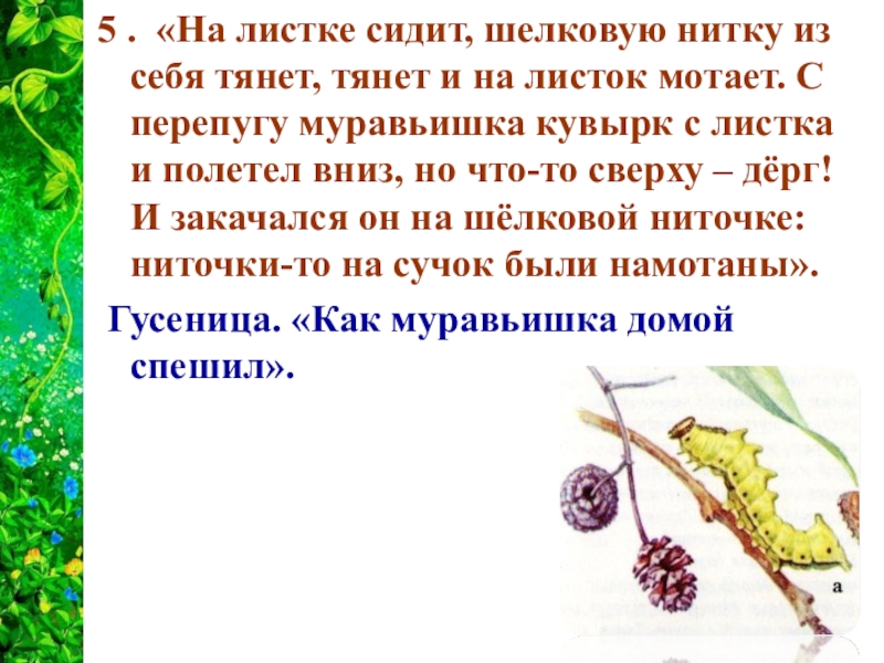 и на листок мотает. С перепугу муравьишка кувырк с листка и полетел вниз, но что-то сверху – дёрг! И закачался он на шёлковой ниточке: ниточки-то на сучок были намотаны».