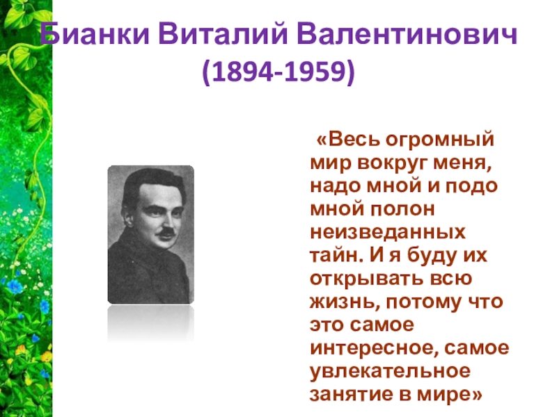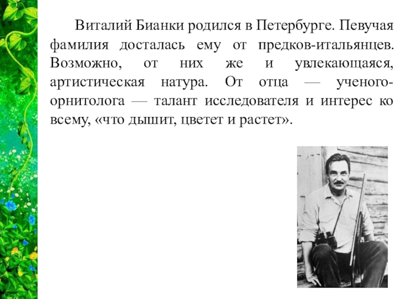Слайд 4 Виталий Бианки родился в Петербурге. Певучая фамилия досталась ему от предков-итальянцев.