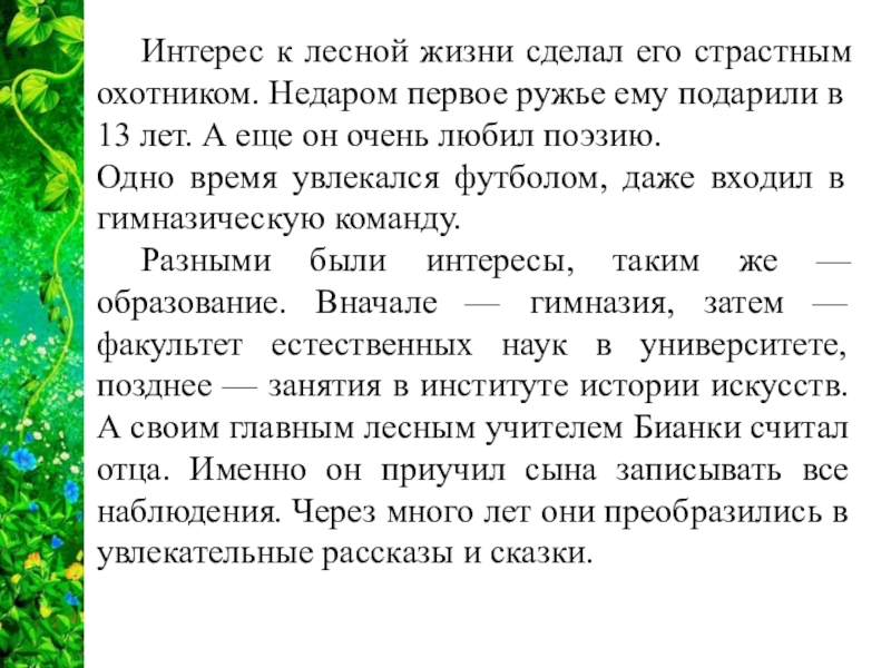 Слайд 5 Интерес к лесной жизни сделал его страстным охотником. Недаром первое ружье