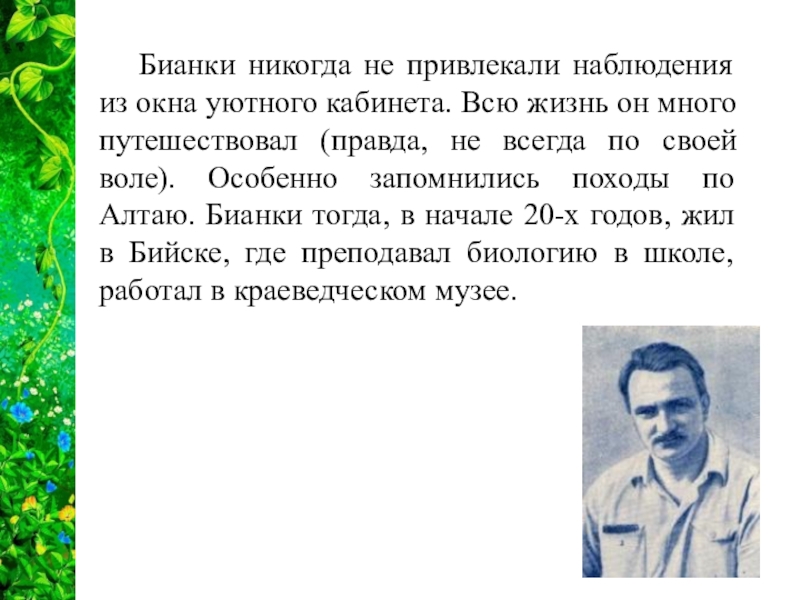 Слайд 6 Бианки никогда не привлекали наблюдения из окна уютного кабинета. Всю жизнь