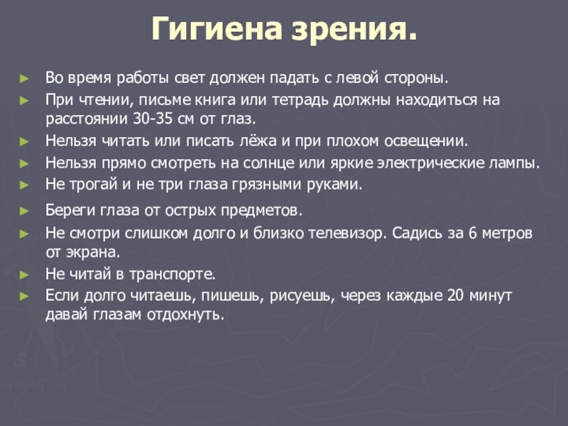 Гигиена зрения. Во время работы свет должен падать с левой стороны.При чтении, письме книга или тетрадь должны