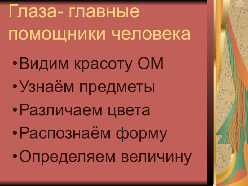 Глаза- главные помощники человекаВидим красоту ОМУзнаём предметыРазличаем цветаРаспознаём формуОпределяем величину
