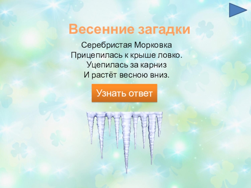 Серебристая Морковка Прицепилась к крыше ловко. Уцепилась за карниз И растёт весною вниз.Узнать ответВесенние загадки