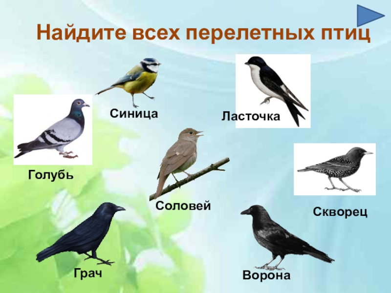 Найдите всех перелетных птицГолубьСиницаЛасточкаГрачВоронаСоловейСкворец
