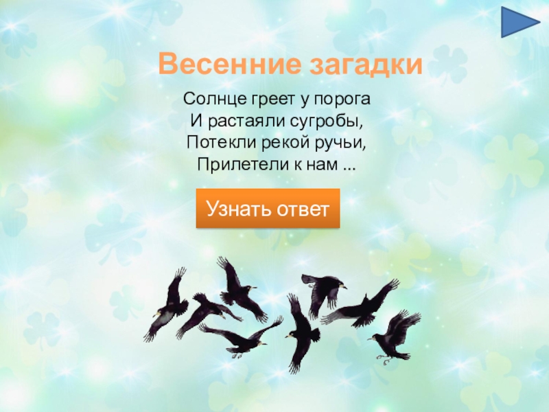Солнце греет у порога  И растаяли сугробы,  Потекли рекой ручьи,  Прилетели к нам ...Узнать ответВесенние загадки