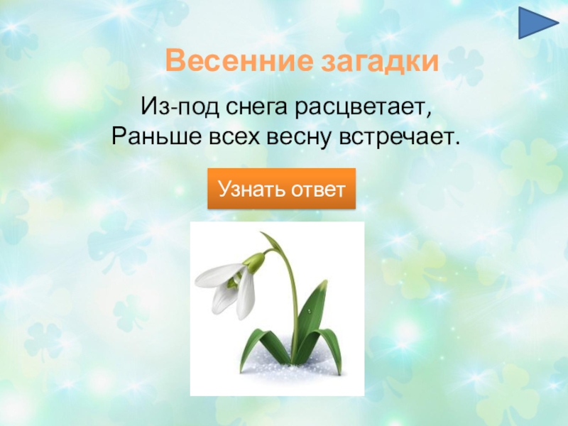 Весенние загадкиИз-под снега расцветает, Раньше всех весну встречает.Узнать ответ