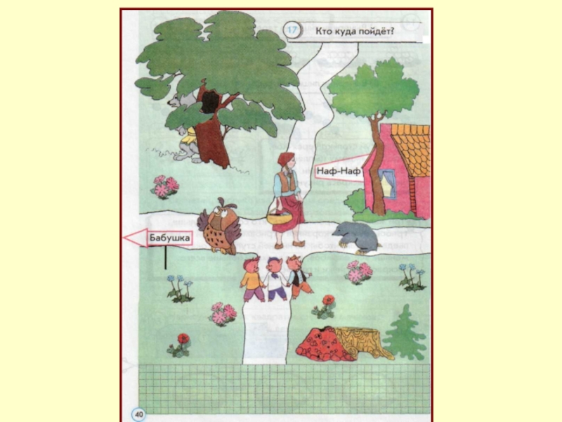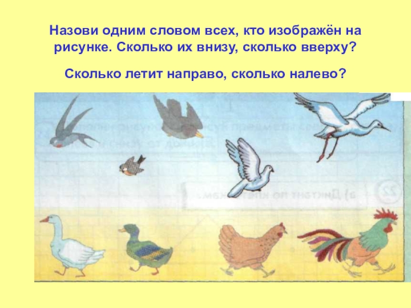 Назови одним словом всех, кто изображён на рисунке. Сколько их внизу, сколько вверху? Сколько летит направо, сколько