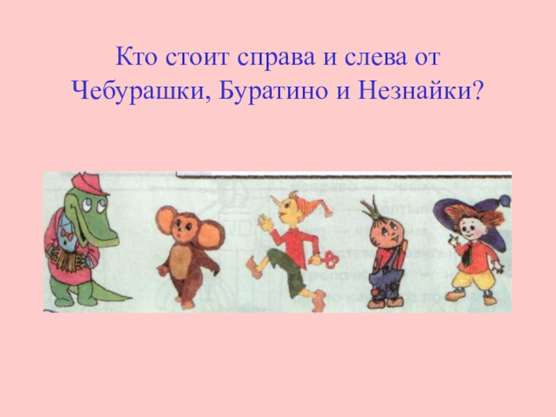Слайд 3Кто стоит справа и слева от Чебурашки, Буратино и Незнайки?
