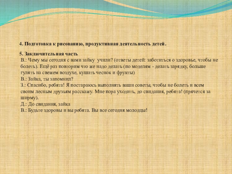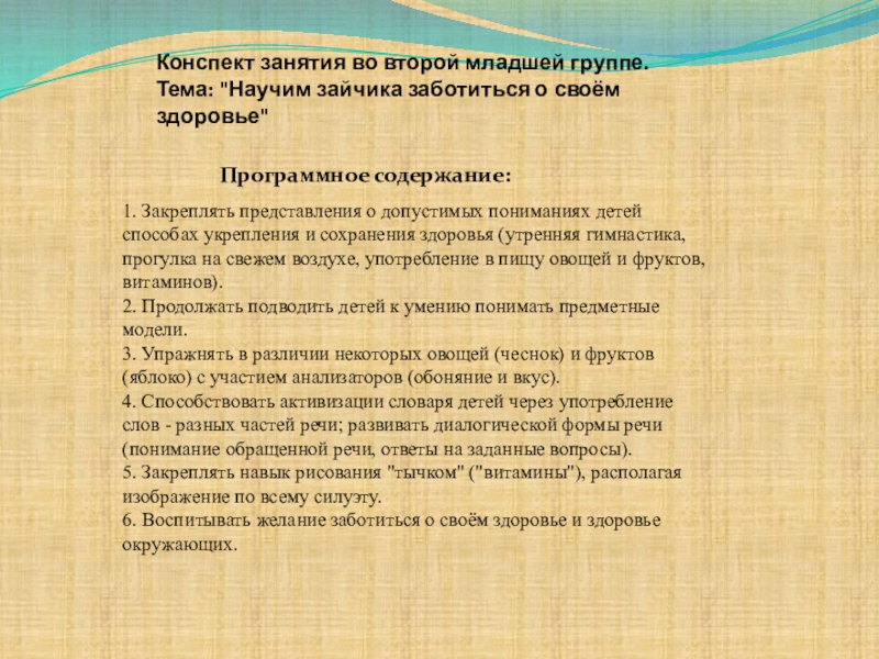 6. Воспитывать желание заботиться о своём здоровье и здоровье окружающих.
