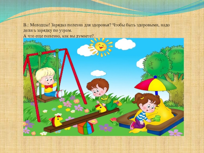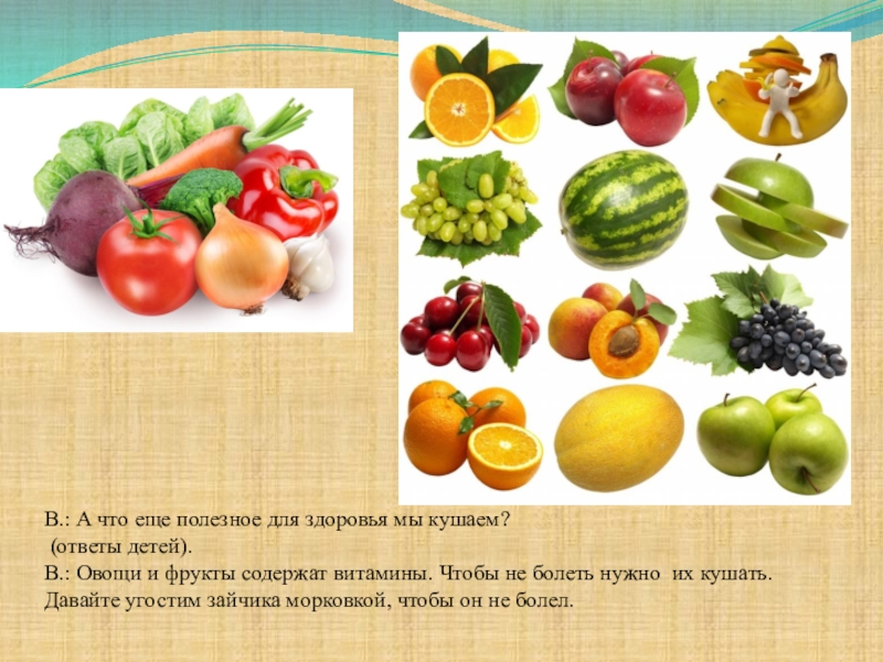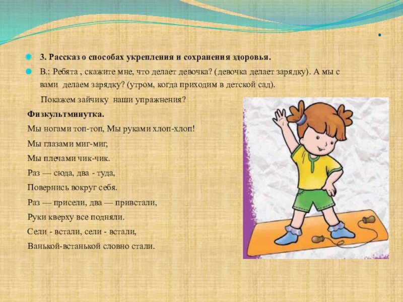 1. Закреплять представления о допустимых пониманиях детей способах укрепления и сохранения здоровья (утренняя гимнастика, прогулка на свежем воздухе, употребление в пищу овощей и фруктов, витаминов).