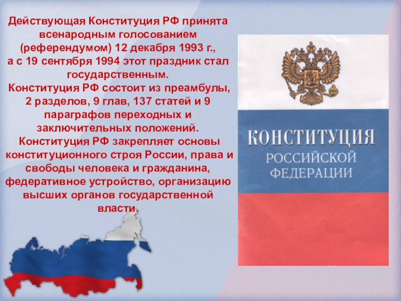 Слайд 9Действующая Конституция РФ принята всенародным голосованием (референдумом) 12 декабря 1993 г.,