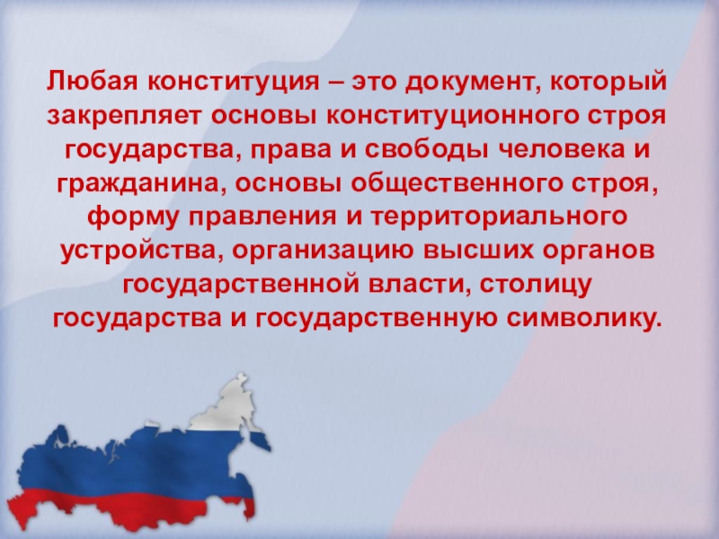 Слайд 8Любая конституция – это документ, который закрепляет основы конституционного строя государства,