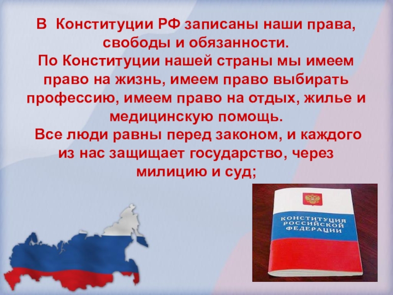 Слайд 10В Конституции РФ записаны наши права, свободы и обязанности.