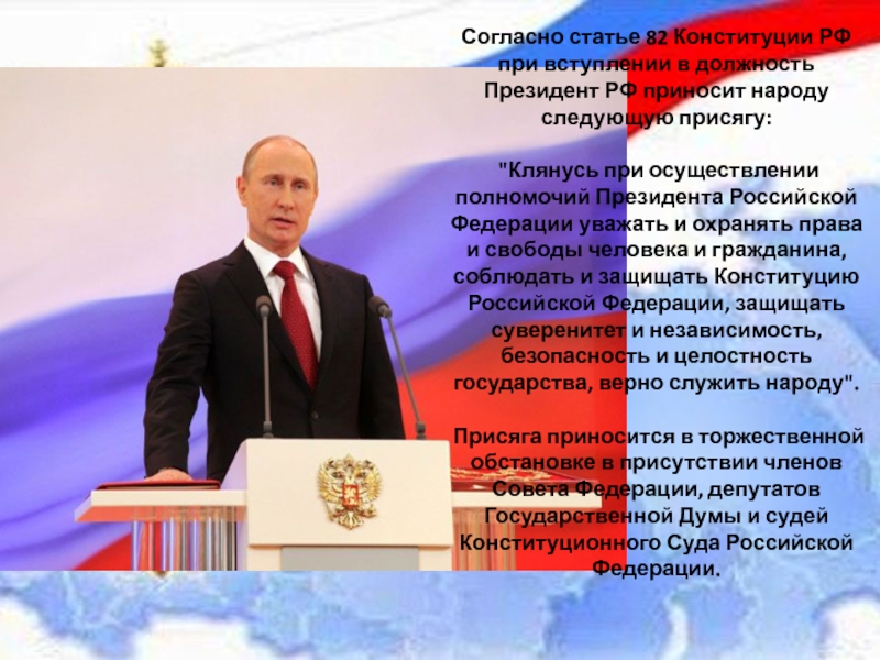 Слайд 13Согласно статье 82 Конституции РФ при вступлении в должность Президент РФ
