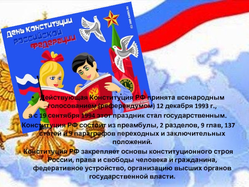 Слайд 10Действующая Конституция РФ принята всенародным голосованием (референдумом) 12 декабря 1993 г.,