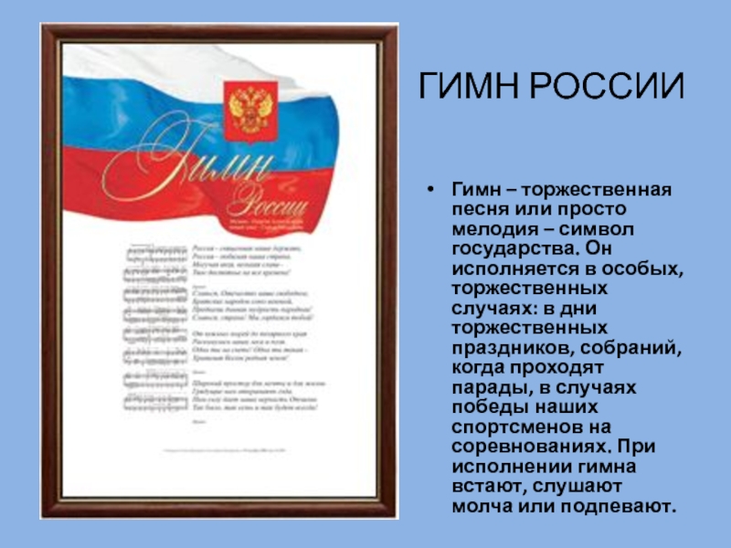 Слайд 3Гимн – торжественная песня или просто мелодия – символ государства. Он