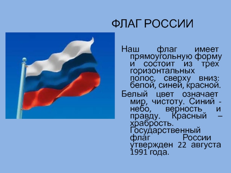Белый цвет означает мир, чистоту. Синий - небо, верность и правду. Красный – храбрость. Государственный флаг России утвержден 22 августа 1991 года.