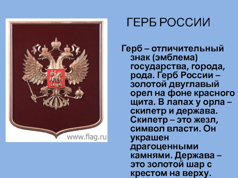 золотой двуглавый орел на фоне красного щита. В лапах у орла – скипетр и держава. Скипетр – это жезл, символ власти. Он украшен драгоценными камнями. Держава – это золотой шар с крестом на верху.