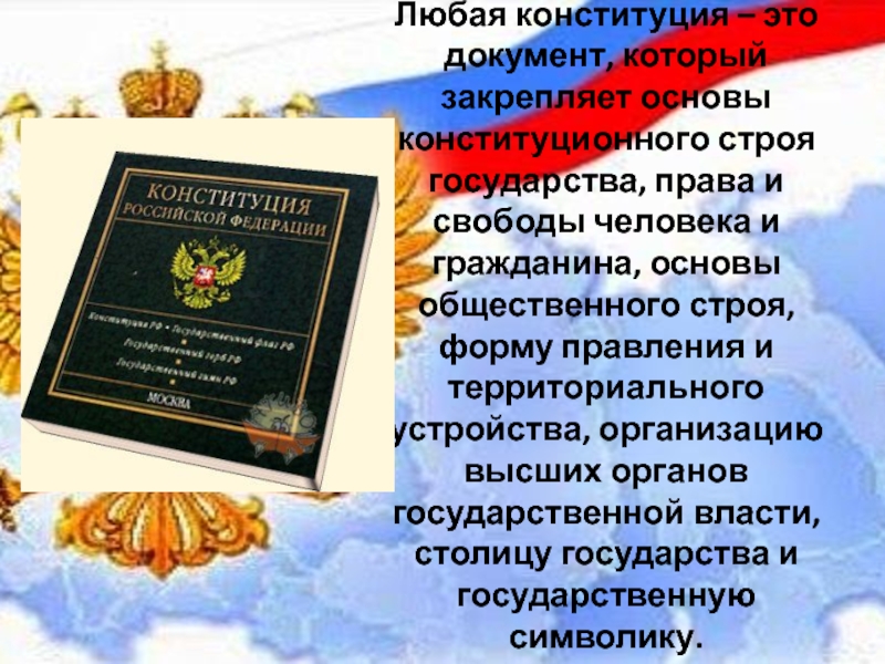 Слайд 8Любая конституция – это документ, который закрепляет основы конституционного строя государства,