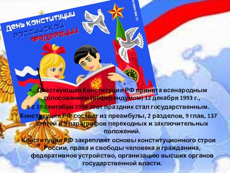 Слайд 10Действующая Конституция РФ принята всенародным голосованием (референдумом) 12 декабря 1993 г.,