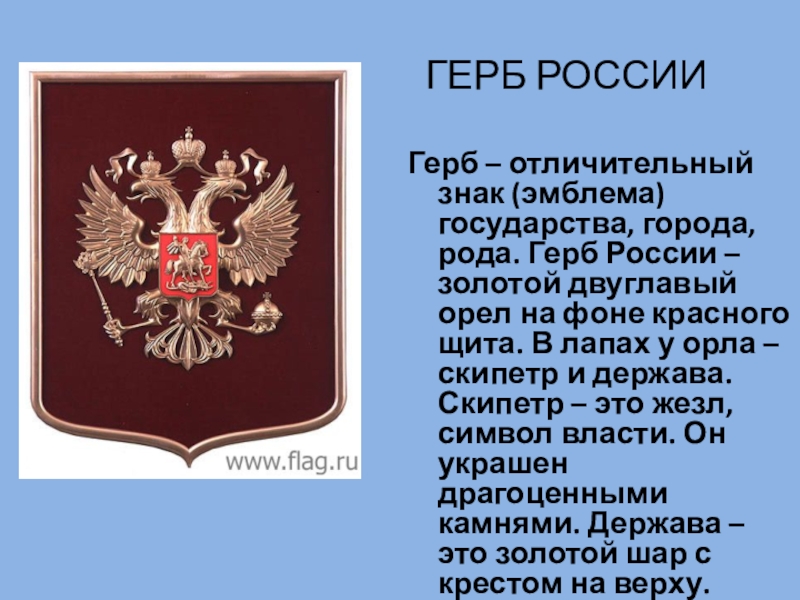 Герб – отличительный знак (эмблема) государства, города, рода. Герб России –