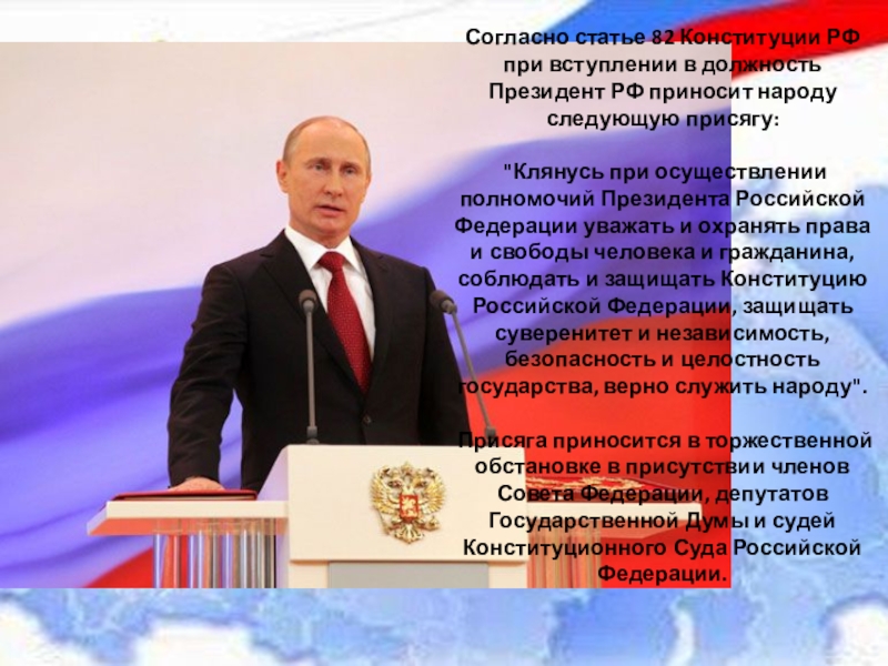 Слайд 13Согласно статье 82 Конституции РФ при вступлении в должность Президент РФ