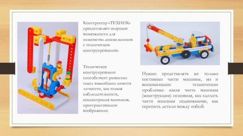 Нужно представлять не только составные части машины, но и возникающие технические проблемы: какая часть машины (конструкции) основная, как сделать части машины подвижными, как скрепить детали между собой.