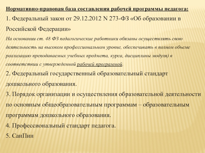 Слайд 9Нормативно-правовая база составления рабочей программы педагога: